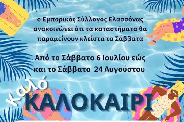 Από τον Εμπορικό Σύλλογο Ελασσόνας ανακοινώνεται, ότι προτείνεται στα καταστήματα-μέλη του Εμπορικού Συλλόγου να παραμείνουν κλειστά τα Σάββατα, από 6 …