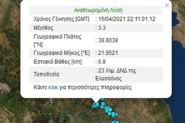 Σήμερα ξημερώματα Τρίτης, σημειώθηκε νέος σεισμός μεγέθους 3,7 βαθμών της Κλίμακας Ρίχτερ με επίκεντρο την περιοχή Νοτιοδυτικά της Ελασσόνας στα …
