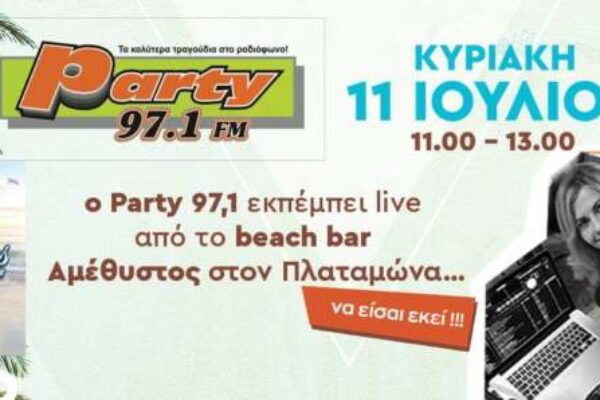 Κυριακή 11 Ιουλίου, ο Party 97,1 πάει παραλία και εκπέμπει ζωντανά από τον Αμέθυστο στον Πλαταμώνα. Το αγαπημένο beach bar …