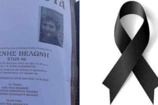 Έφυγε” από τη ζωή η Τσαρτσιανιώτισα Ελένη Βελώνη σε ηλικία 86 χρόνων. Η κηδεία της θα τελεστεί σήμερα Κυριακή 30 …