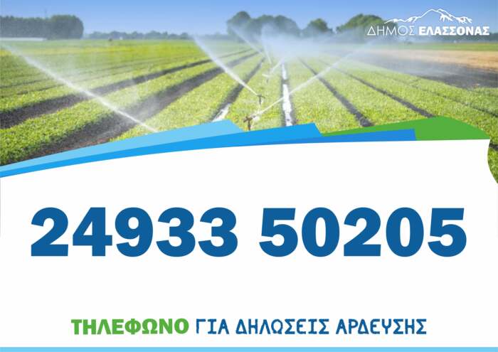 Οι αρδευτές ή εκπρόσωποι τους θα πρέπει να προσέλθουν στο Δημαρχείο Ελασσόνας ώστε να αιτηθούν να συνδεθούν με το δημοτικό αρδευτικό δίκτυο, καθώς καθυστερήσεις που μπορεί να προκαλέσουν οι εκπρόθεσμες δηλώσεις θα οδηγήσουν σε αδυναμία παροχής νερού εντός του προβλεπόμενου χρόνου σε όλες τις κοινότητες.