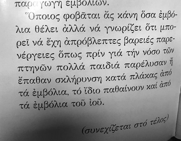 «…Εμείς αρνούμαστε να κάνουμε το εμβόλιο. Όποιος φοβάται, ας κάνει όσα εμβόλια θέλει, αλλά να γνωρίζει ότι μπορεί να έχει απρόβλεπτες βαριές παρενέργειες, όπως είχαν τα εμβόλια που έκαναν στα παιδιά πριν από λίγα χρόνια για τη νόσο των πτηνών και πολλά παρέλυσαν. Όπως επίσης έπαθαν σκλήρυνση κατά πλάκας πολλοί που έκαναν το εμβόλιο της ηπατίτιδας Β΄ και το ίδιο συμβαίνει και με άλλα εμβόλια. Αν δεν φυλάξει ο Θεός, τι μπορούν να κάνουν τα εμβόλια και τα φάρμακα;»