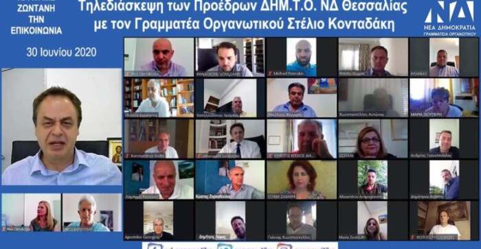 Στις 30 Ιουνίου 2020 πραγματοποιήθηκε ακόμη μία επιτυχημένη τηλεδιάσκεψη του Γραμματέα Οργανωτικού ΣτέλιουΚονταδάκη με τους Προέδρουςτων Δημοτικών Τοπικών Οργανώσεων (ΔΗΜ.Τ.Ο.) Θεσσαλίας, παρουσία της Διευθύντριας – Συντονίστριας Οργανωτικού της ΝΔ Κλαίρης Ξεφτέρη, του Αναπληρωτή Γραμματέα Οργανωτικού Θεσσαλίας Νίκου Καρδούλα, του Αναπληρωτή Γραμματέα Οργανωτικού – Υπεύθυνου Μέσων Κοινωνικής Δικτύωσης, Επικοινωνίας, Συντονισμού & Εκλογικής Ετοιμότητας Κυριάκου Μπουλινάκη, των Προέδρων των Διοικουσών Επιτροπών Εκλογικών Περιφερειών (Δ.Ε.Ε.Π.) Λάρισας Χρήστου Καπετάνου, Τρικάλων Κώστα Τρέλλη και Καρδίτσας Λάμπρου Τσιούκη, των Τομεαρχών Οργανωτικού Λάρισας Παναγιώτη Βούλγαρη, Μαγνησίας Χρήστου Χατζησαλάτα, Τρικάλων ΑθανάσιουΣαρατζιώτηκαι Καρδίτσας Απόστολου Γεωργίου και του Υπεύθυνου Δημοσίων Σχέσεων της Γραμματείας Οργανωτικού Μιχάλη Πατεράκη.