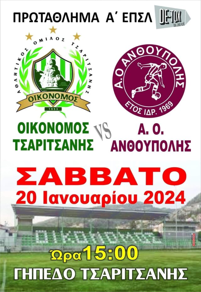 Αύριο Σάββατο 20 Ιανουαρίου 2024 και ώρα 15:00′ στο γήπεδο της Τσαριτσάνης “ΓΙΏΡΓΟΣ ΜΗΤΣΙΜΠΌΝΑΣ” ο Οικονόμος Τσαριτσάνης υποδέχεται για το πρωτάθλημα της Α ΕΠΣΛ Κατηγορίας τον Α Ο ΑΝΘΟΥΠΟΛΗΣ.