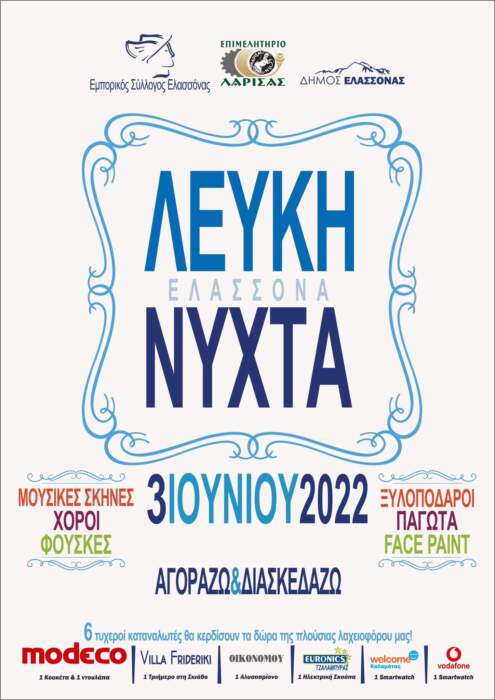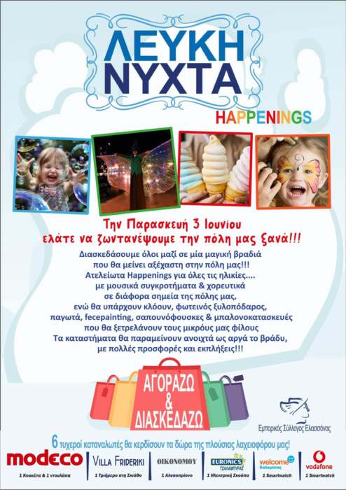 Ο Εμπορικός Σύλλογος Ελασσόνας διοργανώνει την Παρασκευή 3 Ιουνίου την Λευκή νύχτα. Τα καταστήματα θα παραμείνουν ανοιχτά  μέχρι τα μεσάνυχτα . Με πολλές πολλές προσφορές και εκπλήξεις, ενώ δεκάδες δράσεις για μικρούς και μεγάλους θα εκτείνονται  σε όλο το κέντρο της πόλης .  Διασκεδάζουμε όλοι μαζί σε μια βραδιά αξέχαστη για την πόλη μας…Ατελείωτα Happenings με μουσικές σκηνές , κλόουν, φωτεινούς ξυλοπόδαρους, παγωτά, face painting , σαπουνόφουσκες… .Με κάθε αγορά μπαίνεις σε διαγωνισμό με δώρα.