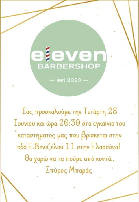 Ένα νέο κουρείο – barbershop εγκαινιάζεται την Τετάρτη 28 Ιουνίου στην κεντρική αγορά της Ελασσόνας στην οδό Βενιζέλου 11 και ώρα 20.30 το απογευμα. Ο ιδιοκτήτης του “Eleven” Σπύρος Μπαράς σας προσκαλεί να δείτε από κοντά το νέο σύγχρονο χώρο και θα χαρεί να σας δει όλους απο κοντά.