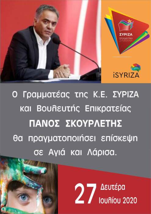 Τη Λάρισα και την Αγιά θα επισκεφθεί τη Δευτέρα 27 Ιουλίου ο Γραμματέας της Κεντρικής Επιτροπής του ΣΥΡΙΖΑ, βουλευτής Επικρατείας, Πάνος Σκουρλέτης, προσκεκλημένος του ΣΥΡΙΖΑ Προοδευτική Συμμαχία Λάρισας.