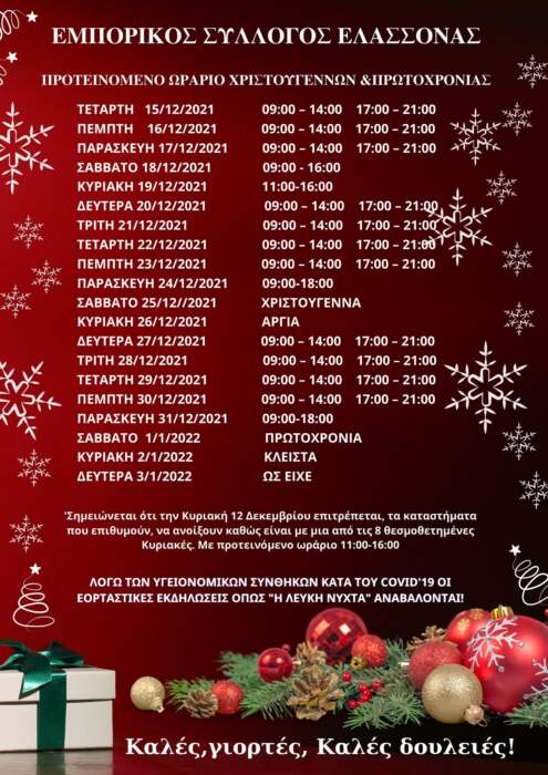 Δείτε το προτεινόμενο ωράριο λειτουργίας των εμπορικών καταστημάτων για τις γιορτές των Χριστουγέννων και της Πρωτοχρονιάς: