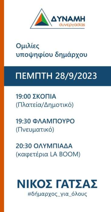Απόψε ο Νίκος Γάτσας θα μιλήσεις στη Σκοπιά, στο Φλάμπουρο και στην Ολυμπιάδα, συνεχίζοντας την προεκλογική του ομιλία.