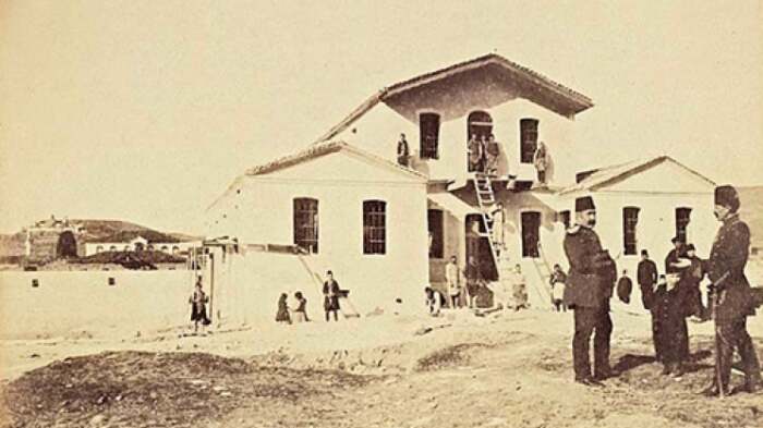 Στη φωτογραφία βλέπουμε ημιτελές το κτίριο, ενώ συνεχίζονται εργασίες κατά την κατασκευή, με 5 μαστόρους στον όροφο, με ποδιά μαστορική, και 5-6 κάτω, όλοι σε πόζα, εκτός από έναν σκυμμένο που κάτι κάνει, ο μόνος που δεν βλέπει τον φωτογράφο. Μία σκάλα εργασίας ξύλινη είναι στημένη στο μπαλκονάκι με τους μαστόρους με τη σκιά της να πέφτει δεξιά, είναι ώρα απόγευμα, μια και γνωρίζουμε τη θέση του κτιρίου στην Ελασσόνα. Υπάρχουν παιδιά και αργόσχολοι που κοιτάζουν προς τον φακό του φωτογράφου. Δύο στρατιωτικοί Οθωμανοί με φέσι, σε πρώτο πλάνο δεξιά, κάνουν πως συζητούν (στημένη πόζα) ο ένας με σπαθί έχει απλωμένο το χέρι σαν σε συζήτηση, με ένα παιδί ανάμεσά τους, με μεγάλο παλτό και με φεσάκι. Τα παράθυρα της όψης είναι όπως και σήμερα 2 πάνω στον όροφο, 6 κάτω, όλα με σιδεριά.