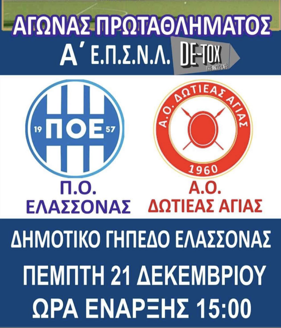 Ένα νέο παιχνίδι πρόκληση περιμένει τον ΠΟ Ελασσόνας αύριο Πέμπτη 21 Δεκεμβρίου 2023, καθώς υποδέχεται στο γήπεδό του στην Ελασσόνα, τον Δωτιέα Αγιάς, στο πλαίσιο του πρωταθλήματος της Α’ ΕΠΣΛ.
