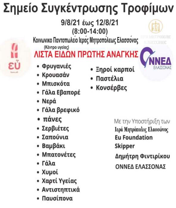 Η ΟΝΝΕΔ Ελασσόνας σε συνεργασία με την Ιερά Μητρόπολη Ελασσώνος και τον φιλανθρωπικό οργανισμό Eu Foundation συλλέγει τρόφιμα και είδη πρώτης ανάγκης για τους πυρόπληκτους στο Κοινωνικό Παντοπωλείο Ιεράς Μητροπόλεως Ελασσόνας.