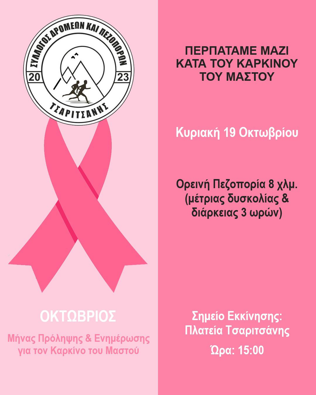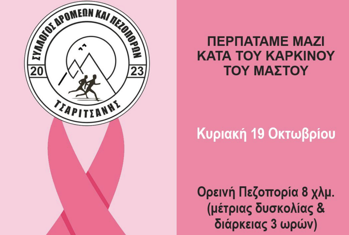 Ο Σύλλογος Δρομέων και Πεζοπόρων Τσαριτσάνης σε συνεργασία με τον Σύλλογο Καρκινοπαθών Λάρισας, θα πραγματοποιήσει Ορεινή Πεζοπορία 8 χλμ. σήμερα Κυριακή 19 Οκτωβρίου, στο πλαίσιο ευαισθητοποίησης για τον Καρκίνο του Μαστού.