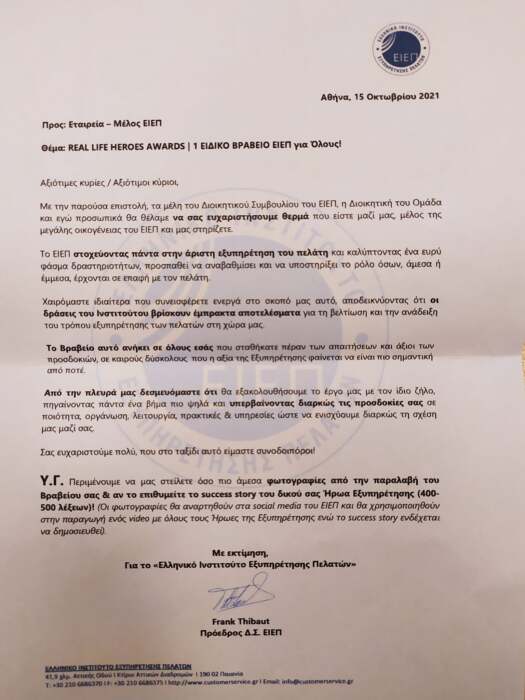 “Μέγιστη τιμή, για το κατάστημα Ελασσόνας της Eurobank, για τους συναδέλφους μου και για εμένα προσωπικά η απονομή με το ειδικό βραβείο “REAL LIFE HEROES AWARD” από το Ελληνικό Ινστιτούτο Εξυπηρέτησης Πελατών.