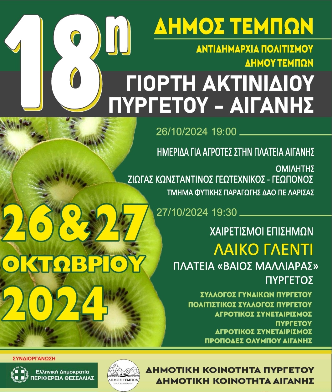 Η 18η Γιορτή Ακτινιδίου ξεκινά την Παρασκευή 26 στην Πλατεία Αιγάνης και συνεχίζεται το Σάββατο 27 Οκτωβρίου, στην Πλατεία “Βάιος Μαλλιάρας” στον Πυργετό. Η γιορτή διοργανώνεται από το Δήμο Τεμπών και την Περιφέρεια Θεσσαλίας σε συνεργασία με τις Δημοτικές Κοινότητες Αιγάνης και Πυργετού, το Σύλλογο Γυναικών Πυργετού, τον Πολιτιστικό Σύλλογο Πυργετού, τον Αγροτικό Συνεταιρισμό Πυργετού και τον Αγροτικό Συνεταιρισμό Πρόποδες Ολύμπου Αιγάνης.