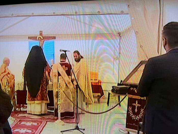 Μία υπαίθρια εκκλησία σε σκηνές  στήθηκε το πρωί της Κυριακής στο Δαμάσι με πρωτοβουλία του Μητροπολίτη Ελασσόνος κκ Χαρίτωνα για τον εκκλησιασμό των σεισμοπλήκτων.